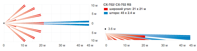ограничение дальности: широкий угол – 12 / 15 / 18 / 21 м узкий угол – 24 / 30 / 36 / 45 м |