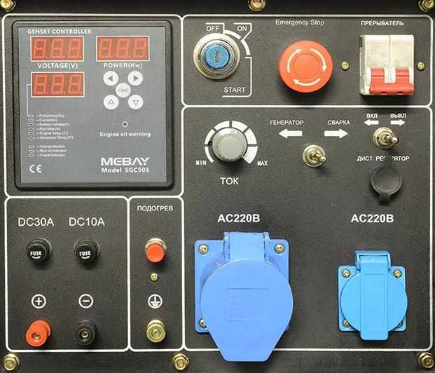• Профессиональный Многофункциональный Дисплей MEBAY SGC501 отображает все основные параметры работы генератора: Силу Тока, Нагрузку, Напряжение, Частоту Тока, и Отработанные Мото-часы для своевременного технического обслуживания.